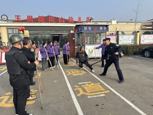 2026年3月10日,王屋派出所民警张继红、刘浩到王屋镇中心幼儿园开展反恐反暴演练。演练前,民警向学校保安人员及老师耐心讲解了反暴器材的使用方法以及实战中如何应对突发情况,演练后,民警对演练进行讲评,指出问题、指导改正,切实提升了校园安防水平,为做好辖区联防反恐工作奠定了坚实基础。