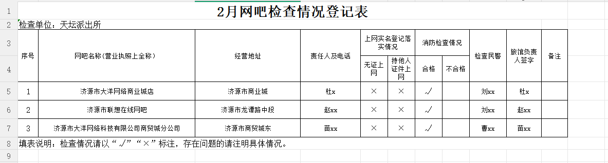 玉川分局天坛派出所行政检查-2026年3月份网吧检查情况登记表