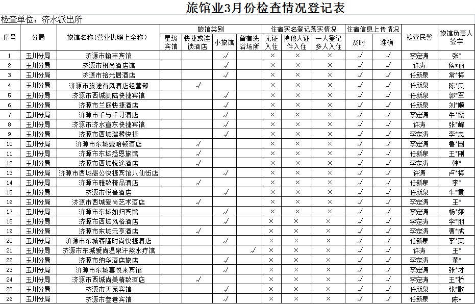 玉川分局济水派出所行政检查-2026年3月份旅馆业检查情况登记表